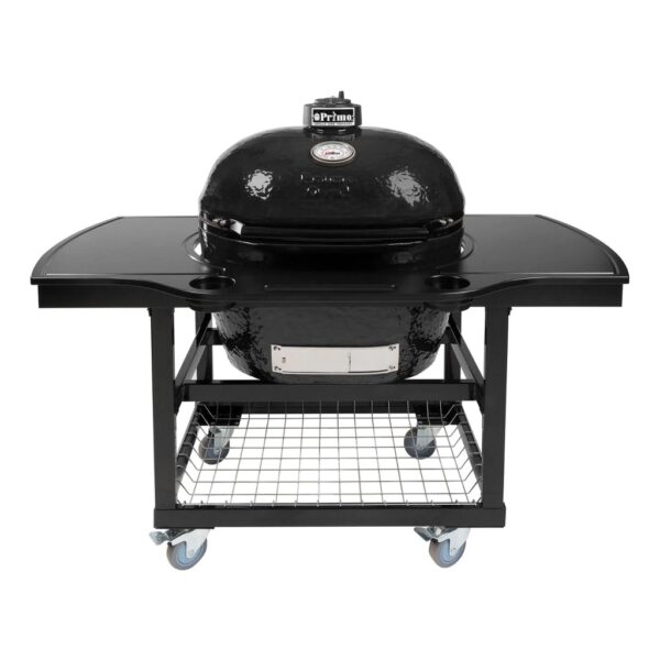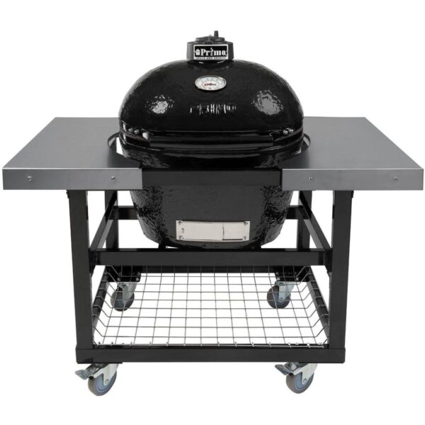 Primo Jack Daniels Edition Oval XL 400 Ceramic Kamado Grill On Steel Cart With 1-Piece Island Side Shelves, Cup Holders, and Stainless Steel Grates – 900