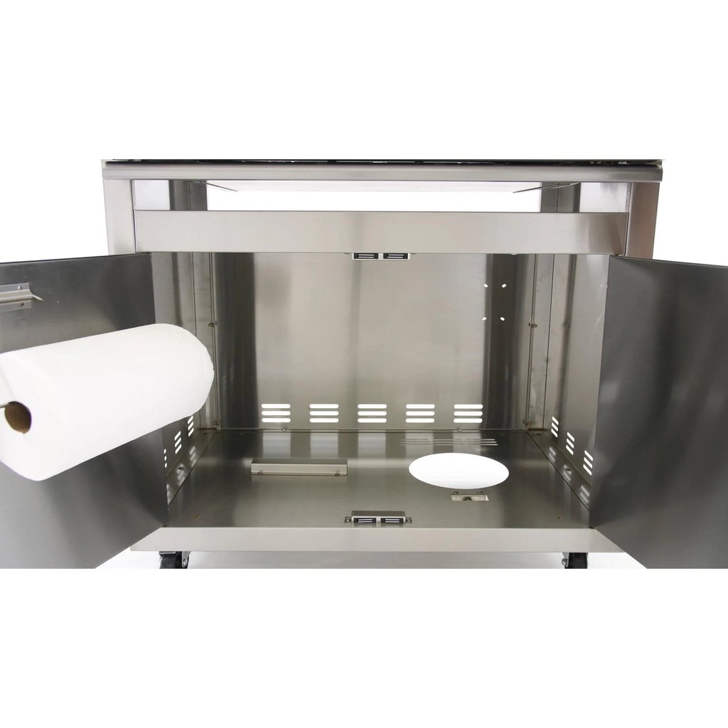 Blaze introduces an affordable commercial style grill that was designed with your outdoor BBQ challenges in mind. This Blaze 32-inch freestanding gas grill comes with four (4) commercial quality 304 cast stainless steel burners that each deliver an impressive 14,000 BTUs of cooking power, for a total of 56,000 BTUs on the cooking surface. The 10,000 BTU infrared rear burner works great with the optional rotisserie kit for grilling versatility. Durable 8mm stainless steel cooking rods maximize your searing capability on the spacious 748 square inches of cooking space. Push and turn flame-thrower primary ignition, backup flash tube secondary ignition and cross-tubes ensure a steady, reliable flame with every start. The removable warming rack is an ideal place to keep bread and other food heated while you grill. The stainless steel heat zone separators allow for different cooking zones across the grilling surface. This adds to your grilling experience, creating separate zones that can be used for different styles of cooking. The flame stabilizing grid minimizes flare-ups while you enjoy your Blaze grill and the full-width drip tray makes clean up a breeze. The stainless steel grill cart features two front doors for storing your tank, grill cover and BBQ accessories. The cart also includes four heavy duty caster wheels, allowing you to relocate the grill easily whenever necessary, and two side shelves for a convenient work area. The 304 stainless steel grill hood is double-lined to protect the outer layer from heat discoloration, keeping your Blaze grill looking shiny and new! This product is ETL certified with an ANSI Z21.58-2018/CSA 1.6 rating.