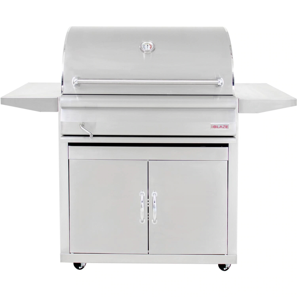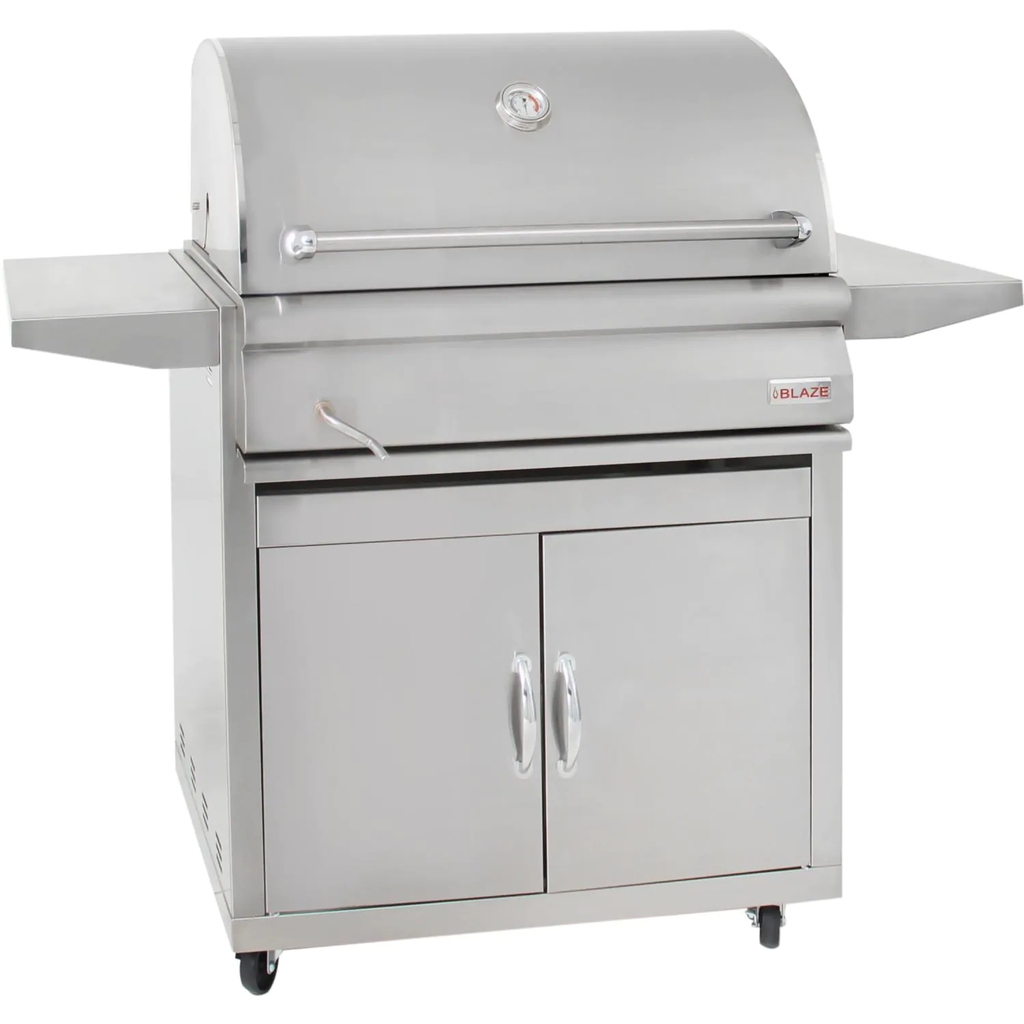 Blaze offers an affordable, commercial style charcoal grill designed with your outdoor BBQ desires in mind. This American-made charcoal grill features precision cut, 304 stainless steel components which bring the promise of lasting durability to your outdoor BBQ! The stainless steel rod cooking grates maximize searing capability on the generous 550 square inches of cooking space. The cooking grates feature an easy hook and hang system for adding more charcoal or wood while cooking. Use one of the included two grill hooks to simply lift the grate and hook it to the top of the grill when adding more charcoal. Beneath the cooking grates, the adjustable charcoal tray offers powerful grilling versatility, allowing you to easily raise the tray when searing at high temperatures or move it down for low temperature cooking. The rear vents are adjustable for more control over the airflow. The charcoal tray is also removable and the full-width pull out ash pan makes cleaning a breeze. The stainless steel grill cart features two front doors for storing your grill cover and BBQ accessories. The cart also includes four heavy duty caster wheels, allowing you to relocate the grill easily whenever necessary, and two side shelves for a convenient work area. The 304 stainless steel grill hood is double-lined to protect the outer layer from heat discoloration, keeping your Blaze grill looking shiny and new!