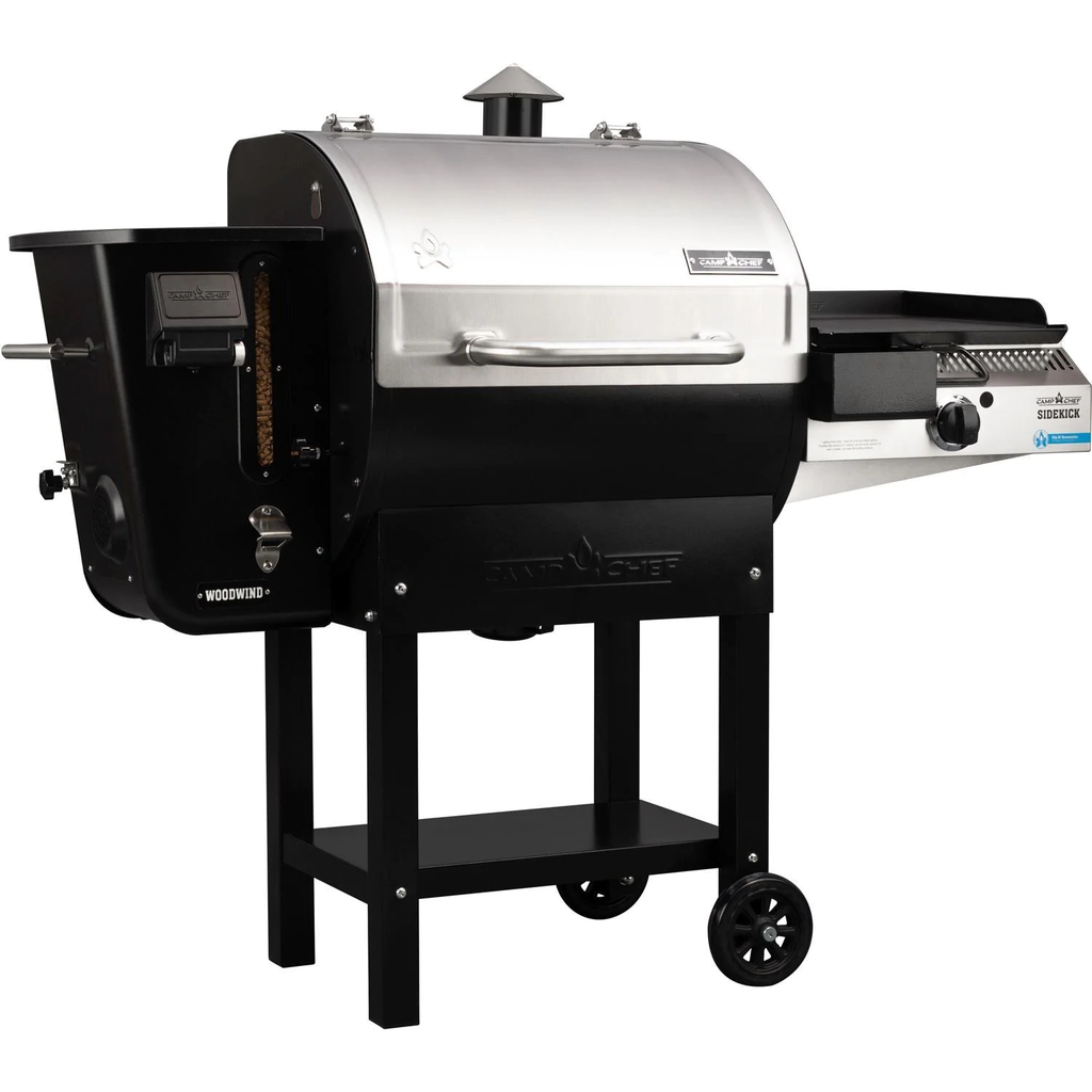 Take your grilling game to the next level with the Camp Chef Woodwind WiFi, featuring all of your favorite Woodwind series features, plus a full-color display, WiFi and Bluetooth-enabled PID controller that lets you control your cooks from the palm of your hand. Set temperatures, adjust smoke levels, set timers and even receive notifications when your meat reaches desired temperature using the Camp Chef Connect app on your mobile device. With the turn of a knob or tap of a finger you can set temperatures as low as 160 degrees for smoking and up to 500 degrees for the perfect sear. Smart Smoke technology keeps your Camp Chef pellet grill within 15 degrees of your selected temperature. Adjust smoke intensity just as easily with 10 levels to choose from. The PID controller also allows you to connect and monitor up to 4 meat probes and grill temperatures simultaneously, it even has a built-in cover to protect the display when not in use. The Woodwind WiFi is constructed of durable powder coated steel with a stainless steel lid and fire box. It features a 19 1/2 by 22 inch enameled-steel primary cooking area and a 2-piece nickel plated upper rack for 797 square inches of total cooking space, all heated by up to 25,000 BTUs of cooking power. The 2-piece upper rack is also height adjustable, giving you more room for taller food without having to completely remove the upper rack. The automatic auger dispenses pellets as needed from the high capacity hopper, which holds up to 22 pounds of pellets at once and has a viewing window and pellet purge feature for emptying or changing out pellets. The hopper even has a built-in bottle opener and a chord wrap for extra convenience. Slide and Grill technology allows you to switch between direct and indirect flame cooking with just the pull of a knob. A continuous fan insures that your grill stays evenly heated and smoky, so every bit of food is perfectly cooked. When you are done cooking, clean up is easy, thanks to the exclusive Camp Chef ash cleanout system. Simply pull open the trap door with the side knob and empty the ash cup underneath the grill. This grill also features a pair of large, heavy-duty wheels for easy rolling and maneuverability, and a powder coated steel bottom shelf. Includes 4 stainless steel meat probes. This Woodwind WiFi also includes a Sidekick, which has a 30,000 BTU cast aluminum burner and 231 square inch True Seasoned griddle surface. Remove the griddle plate to use the Sidekick as a powerful stove, great for frying or boiling. The Sidekick also has matchless ignition using a fully adjustable heat-control knob, and Wind Baffled Technology to prevent your burner from being blown out. A hose, regulator, and holding bracket are included for a 20-pound propane tank (tank not included).