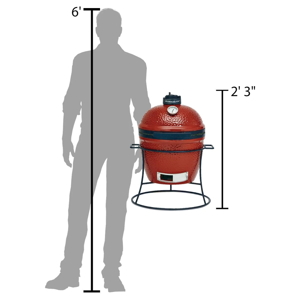 Kamado Joe presents the perfect grill for any backyard barbecue, with the Joe Junior ceramic Kamado grill on stand. The Joe Junior Kamado is a grill, smoker and oven all in one, and can be ready to cook in 15 minutes. This Kamado grill is constructed from 1 1/4-inch thick ceramics, allowing it to hold heat and maintain temperature control, burning less fuel and saving you money. The thick, porous ceramic keeps moisture in your food, producing incredibly tender food with a true wood-fired flavor. All Kamado Joe ceramic grills are crafted with a heat-resistant ceramic coating, their own special recipe, to keep your grill looking as good as it performs. You can enjoy the luxury of cooking on 149 square inches of grilling area, with a commercial-grade 304 stainless steel hinged cooking grate that allows you to easily add more charcoal. The stainless steel draft door allows you to control the airflow and temperature within the grill. The lid hinge is made of powder-coated galvanized iron and the fire grate is made of powder coated cast iron for durability and superior heating performance. The built-in thermometer allows you to monitor cooking temperatures, even when the grill lid is shut, and the powder-coated cast iron grill stand has handles so that you can take this portable unit with you camping or tailgating. The black finished HDPE handle provides a cool, comfortable grip. The KJ13 Joe Junior Kamado grill also comes with a free grate gripper, ash tool and heat deflector for indirect cooking. Dimensions With Stand (in inches): 19 3/4 W X 20 3/4 D X 27 H. Dimensions Without Stand (in inches): 16 W X 20 3/4 D X 22 H.