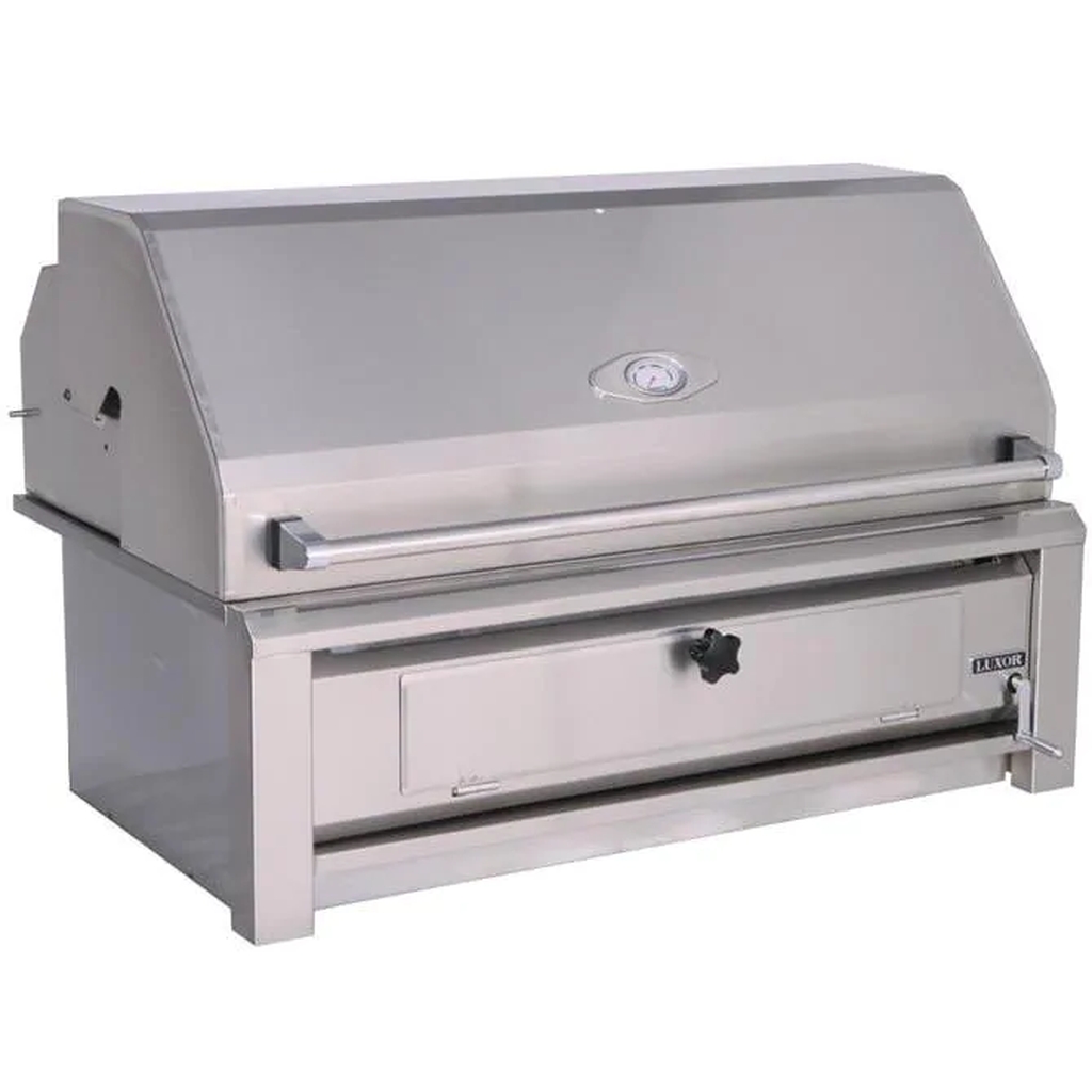 This Luxor 42-inch built-in charcoal grill features 1050 square-inches of total cooking area, seamless 304 grade stainless steel construction with polished edges, stainless steel warming rack, crank lift to adjust charcoal pan, charcoal access door, removable ash pan, thermometer and solid 3/8-inch diameter stainless steel rod cooking grid.