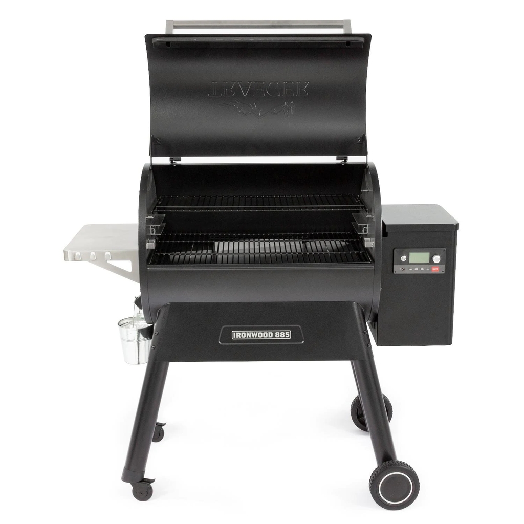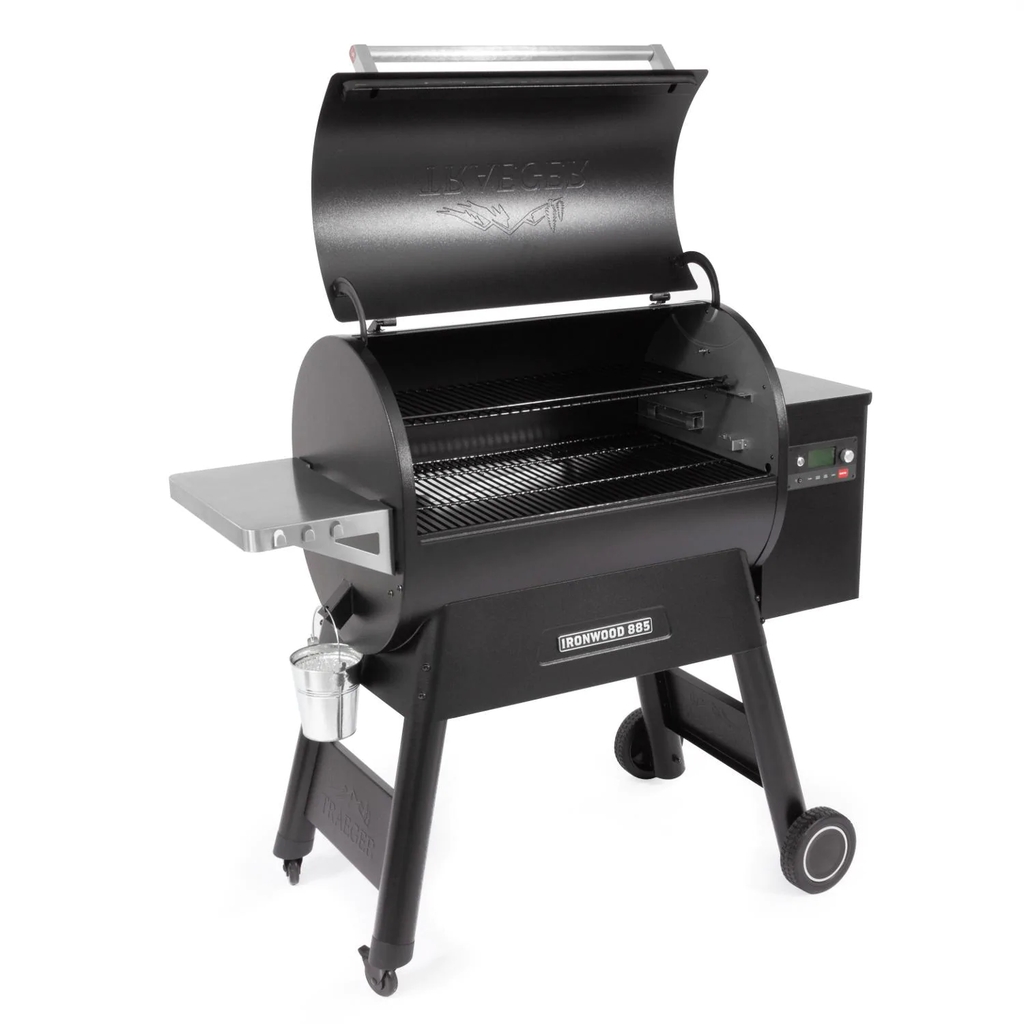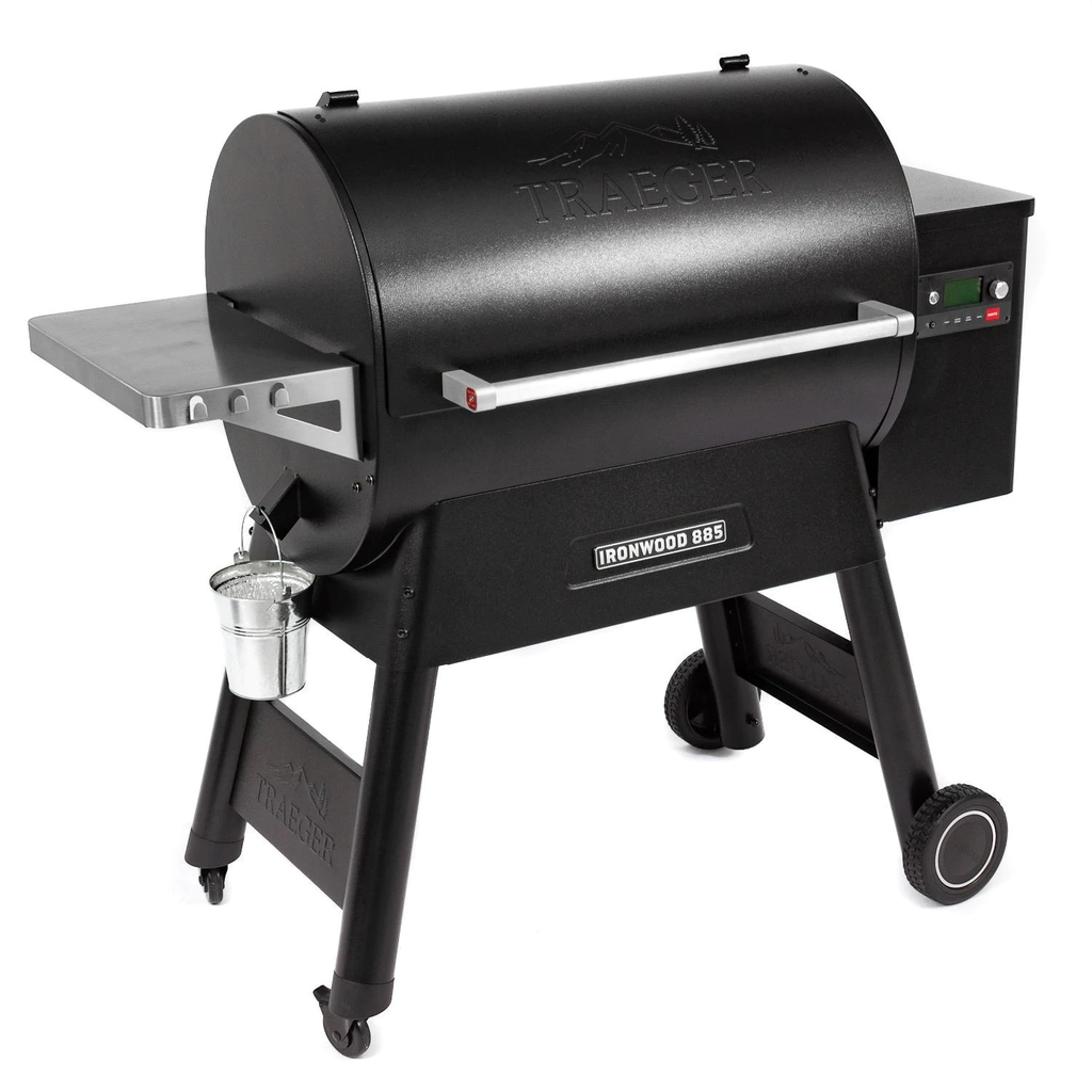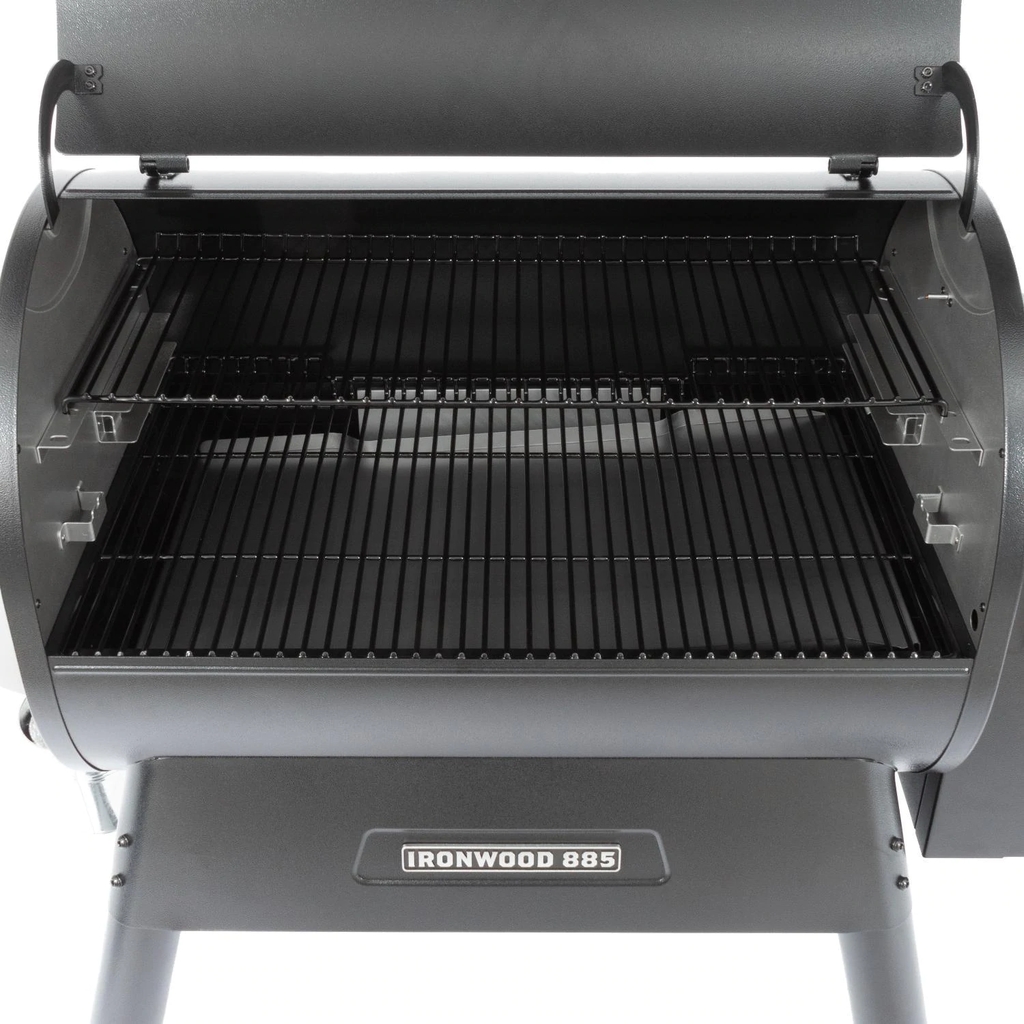 Elevate your craft with the Traeger Ironwood 885. Grill more food and enjoy more versatility with 885 square inches of cooking area. The bottom cooking grate can be lowered for searing juicy steaks, or raised for grilling. TRU Convection system and Traeger Downdraft Exhaust system, fully circulate fresh blue smoke keeping smoke in the chamber longer, as well as maintaining an even heat and increasing the efficiency of the grill. The D2 Direct Drive drivetrain technology makes the Ironwoods more durable, with the DC brushless motor, and also increases the efficiency of the grill with Turbo Temp fast start-up, and the variable speed fan. The Keep Warm mode lets you decide when you are ready to eat, not when the food is ready. The Ironwood also features double side walled insulation for better temperature control. An easy to use control panel & digital display gives you full control with a navigation dial and dedicated buttons for creating custom cook cycles and quick access to handy functions like keep warm mode and Super Smoke Mode, amping up the flavor with the push of a button. Tired of babysitting your grill? Try out the WiFIRE controller to change the temperature, set timers, and access thousands of Traeger recipes using the Traeger app and your smart phone (available for iOS & Android devices). The WiFIRE controller is also compatible with Google Home and Amazon Alexa enabled devices, allowing you to control grilling temperatures, monitor internal temperature of food, set timers and create alerts using voice commands. Comes with a built-in Traeger Pellet Sensor, which monitors the level of pellets in your hopper and alerts you with app notifications when it is time to refuel. The included meat probe stores above the control panel for quick access, easily connecting to a dedicated control panel port for precise monitoring. There’s no shortage of food prep convenience with a stainless steel side shelf with BBQ tool hooks and a full-length folding front-shelf. Keep the fire burning with a large capacity pellet hopper, holding up to 20 pounds of Traeger hardwood pellets. A hopper clean-out door lets you quickly empty contents for cleaning and swapping out flavors. Tucked away out of sight, is a concealed grease pan that slides out for easy cleanup. The Ironwood is built to outlast the competition from the ground up with a rock-solid sawhorse-style chassis, all-terrain wheels, heavy-duty locking casters and black powder coat finish. The Traeger Ironwood 885 has a temperature range of 165-500 degrees Fahrenheit.