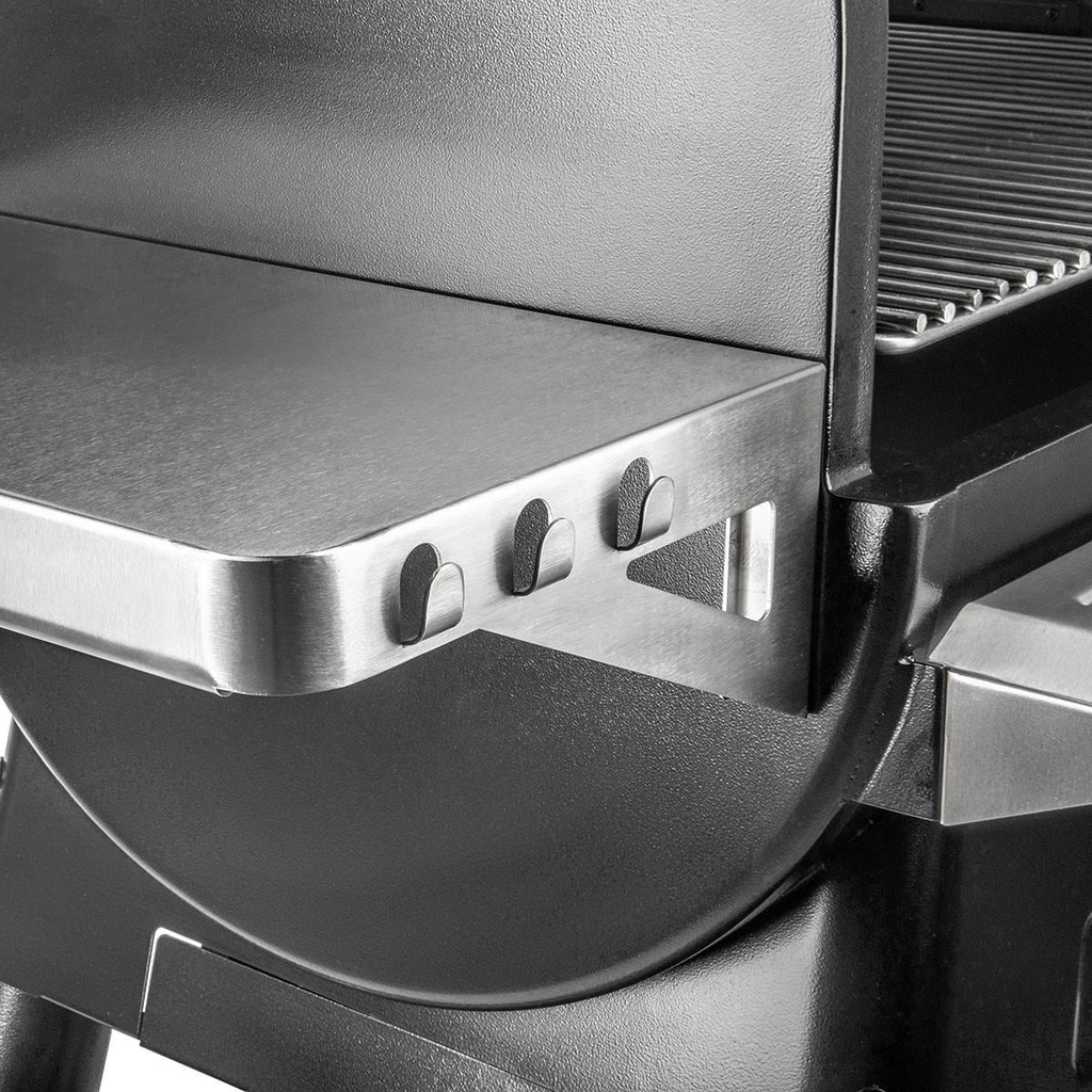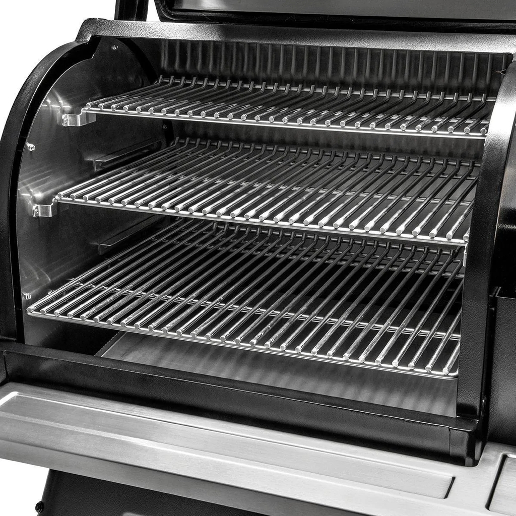 Join the Hall of Flame with the Traeger Timberline 1300. Grill more food and enjoy more versatility with 1300 square inches of cooking area over three tiers of dual-position stainless steel cooking grids. The bottom cooking grate can be lowered for searing juicy steaks, or raised for grilling. Cook up to 38 burgers, 6 chickens, 54 hot dogs or 9 rib racks 20% faster and with more smoky flavor than ever thanks to the TRU Convection system and Traeger Downdraft Exhaust system, fully circulating fresh blue smoke using a built-in induction fan. The Timberline features a double-walled 304 stainless steel interior and airtight lid gasket to insulate and maintain heat for unbeatable temperature control from 165-500 degrees Fahrenheit. An easy to use control panel & digital display gives you full control with a navigation dial and dedicated buttons for creating custom cook cycles and quick access to handy functions like keep warm mode and Super Smoke Mode, amping up the flavor with the push of a button. Tired of babysitting your grill? Try out the WiFIRE controller to change the temperature, set timers, and access thousands of Traeger recipes using the Traeger app and your smart phone (available for iOS & Android devices). The WiFire controller is also compatible with Google Home and Amazon Alexa enabled devices, allowing you to control grilling temperatures, monitor internal temperature of food, set timers and create alerts using voice commands. The included meat probe stores above the control panel for quick access, easily connecting to a dedicated control panel port for precise monitoring. There’s no shortage of food prep convenience with a stainless steel side shelf with BBQ tool hooks, a full-length stainless steel front-shelf and a magnetic bamboo cutting board that stores above the pellet hopper. Keep the fire burning with an extra large capacity pellet hopper, holding up to 24 pounds of Traeger hardwood pellets. A pellet sensor in the hopper allows you to keep track of fuel levels using the Traeger app and alerts you when the hopper is running low. A hopper clean-out door lets you quickly empty contents for cleaning and swapping out flavors. Tucked away out of sight, is a concealed grease pan slides out for easy cleanup. The Timberline is built to outlast the competition from the ground up with a rock-solid sawhorse-style chassis, all-terrain wheels, heavy-duty locking casters and black powder coat finish.