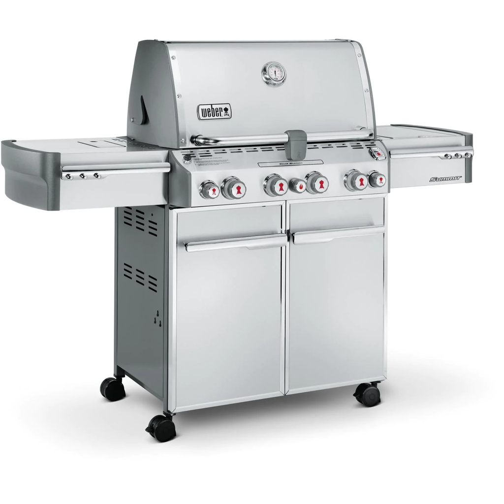 Summit Series gas BBQ grills are the crown jewels of the Weber family, with exclusive features, the highest level of performance and stunning looks. The Weber Summit S-470 is a backyard superstar that will make you say Oh. My. Grill. The stainless steel S-470 features 4 stainless steel burners that produce 48,800 BTUs and a 10,600 BTU Sear Station, each with Snap-Jet individual burner ignition to help you get the party started as quickly as possible. The Summit S series propane gas grill comes fully equipped with 9mm (3/8 inch) stainless steel rod cooking grates and stainless steel Flavorizer bars to effectively hold and distribute heat evenly over the 468 square-inch main cooking grid. The warming rack provides an additional 112 square inches for a generous 580 square inches of total cooking area. Summit grills come equipped with a stainless steel grease tray with a catch pan to make clean-up as easy as possible. The Weber S-470 also has a 12,000 BTU flush-mounted side burner that lets you multi-task while grilling, a stainless steel smoker box with a dedicated 6,800 BTU smoker burner and a 10,600 BTU infrared rotisserie rear burner. The Tuck-Away rotisserie system features a flip-up motor and separate spit rod and fork storage inside the cart. This Weber Summit grill has a painted steel frame and a front-mounted control panel with LED lighted control knobs and a backlit LED propane scale, which works in conjunction with the precision fuel gauge to let you know exactly where you stand on fuel at all times. The stainless steel shroud will withstand the elements for years to come and has a polished stainless steel handle and a center-mounted thermometer to monitor cooking temperatures. The grill cart features stainless steel doors, chrome plated cast-aluminum handles, painted side and rear panels and four heavy-duty casters (2 locking and 2 swivel). The enclosed storage area keeps your propane tank out of sight, two stainless steel side shelves with painted cast aluminum end caps provide expansive prep space and the six convenient built-in tool hooks keep your BBQ tools nearby. Light up your grill with the Grill Out handle light, which features an integrated tilt sensor that automatically turns the light on when the lid is raised and off when the lid is closed. With the Weber Summit S-470, welcome to the top-of-the-line! Please note, the grill height dimension listed in the specifications are with the grill lid open. Please note this Weber grill cannot be converted to run on a different fuel type. Be careful when selecting the fuel type desired.